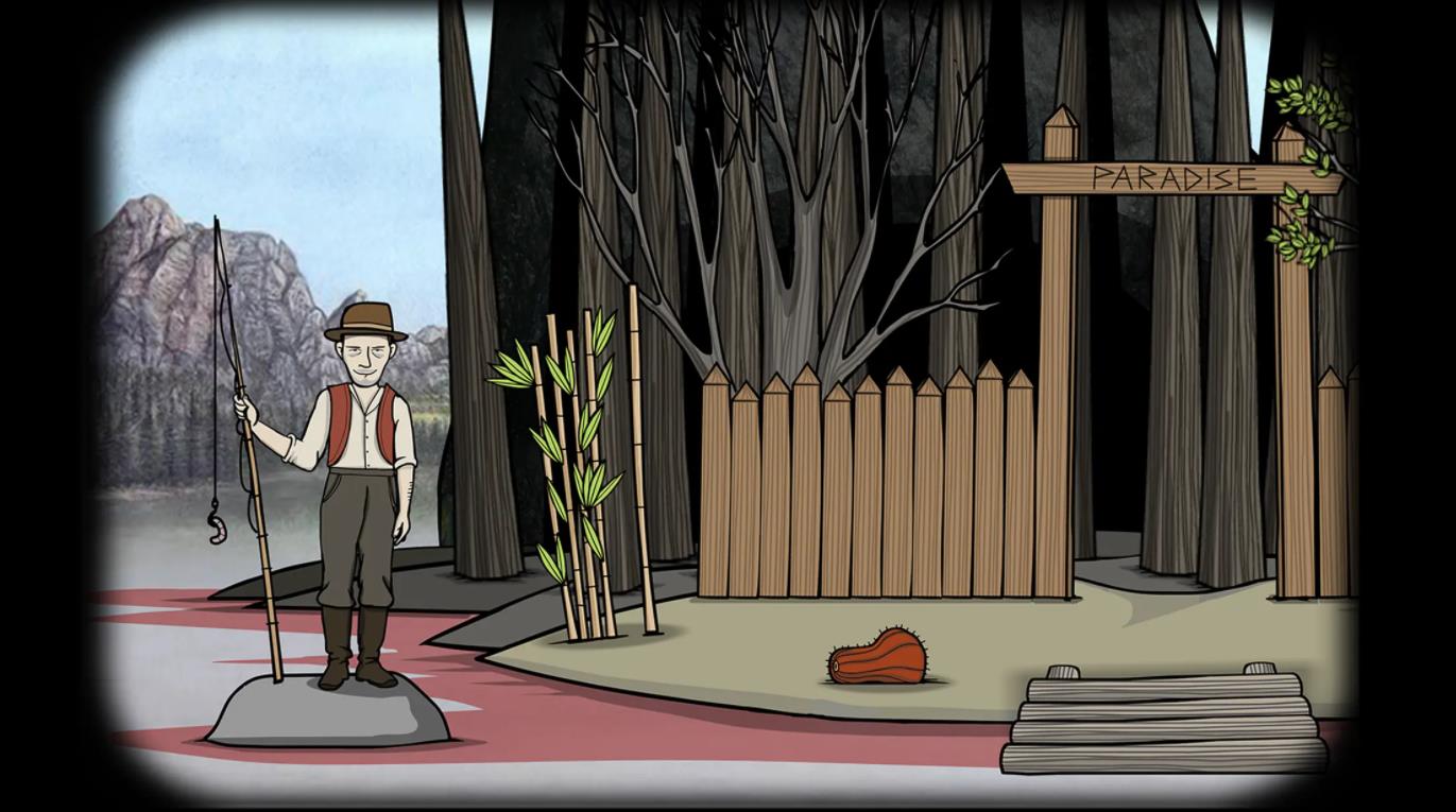 4、进入天堂岛内部之后,在不远处发现了一个老奶奶,点击老奶奶鼻子可以找到一个水蛭,视角向右,往森林深处走,来到一处房子内部,看到有个穿着得体的男人正在用餐,而我们钓上来的虾给了他享用,我们用弯刀把虾砍断,拿到第二只水蛭。