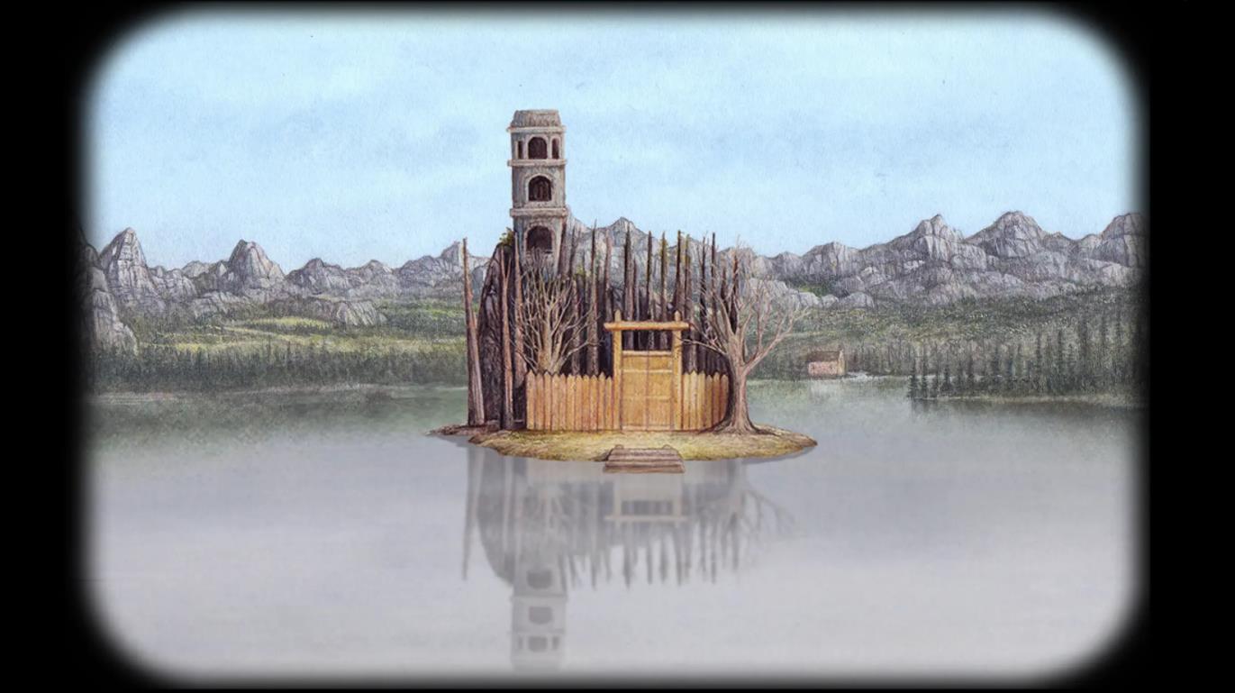 8、来到锈湖后,查看左边的血水,点击一下会从水里冒起来一口棺材,我们将周围钉子全部拿掉后拿到一个黑色方块。完成之后我们把黑色方块放入右边建筑物里的吊饰中,第一关结束。