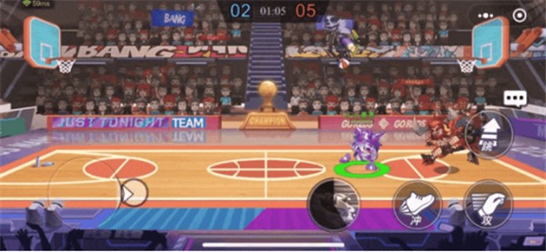 如果我们拿到了球,对手距离非常近,我们离球框还比较远时就可以跳起来用【虚拟闪现】+【冲】,瞬间到达篮筐扣篮。注意:技能和冲刺一定要紧接着按,不然可能会因为冲刺过慢导致角色回到地面,CD无法重置。