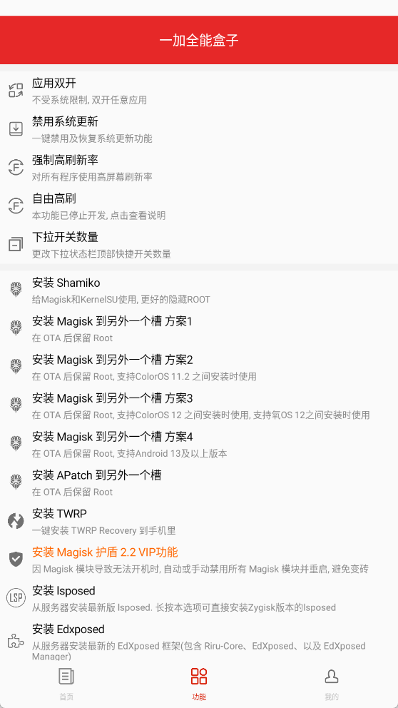 一加全能盒子(大侠阿木自制)是由开发者阿木独立设计的手机实用工具。该程序最突出的功能是帮助用户简化刷机流程,同时支持应用双开与强制刷新率切换。需要特别说明的是,本工具仅适配一加品牌部分型号设备,具体适用机型请参阅下文说明,避免不当操作带来的问题。