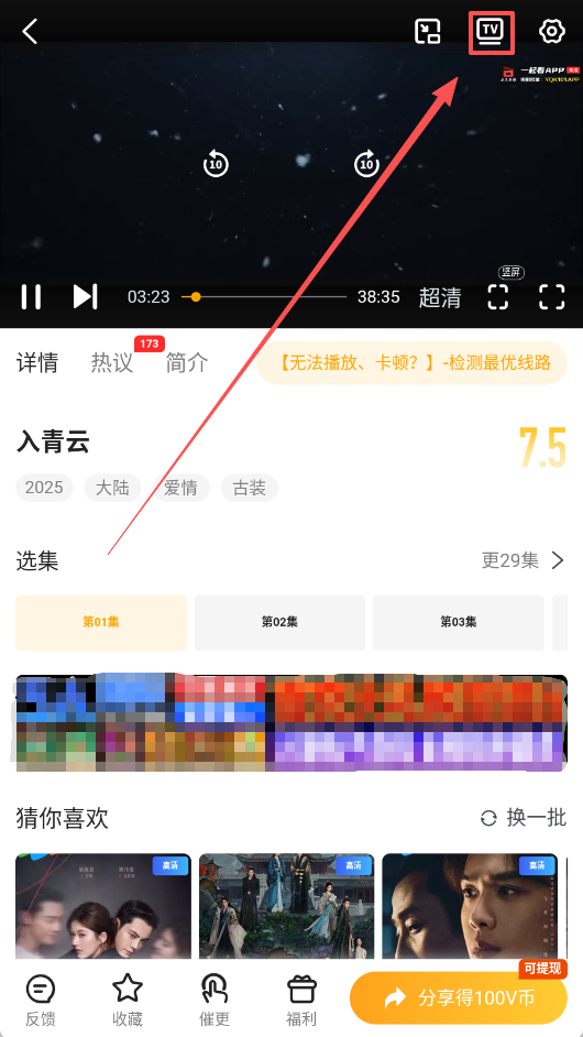 2、来到播放界面后,点击右上角的“TV”电视图标,点击一下